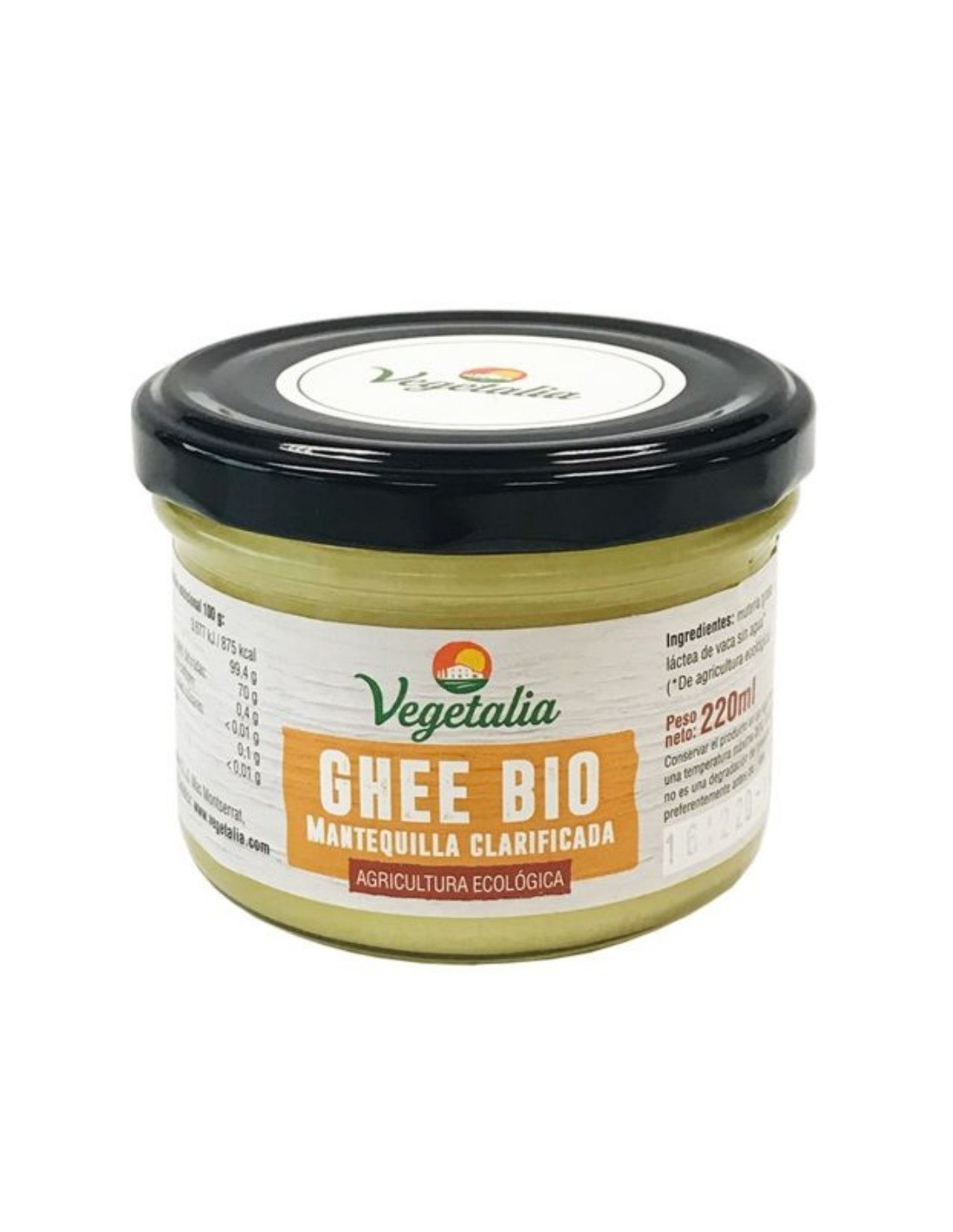 Das Ghee Mantequilla Clarificada Bio 220ml von Vegetalia ist ein natürliches Bio-Fett, reich an den Vitaminen A, D, E und K, ideal zum Kochen bei hohen Temperaturen und geeignet für Menschen mit Laktoseintoleranz.