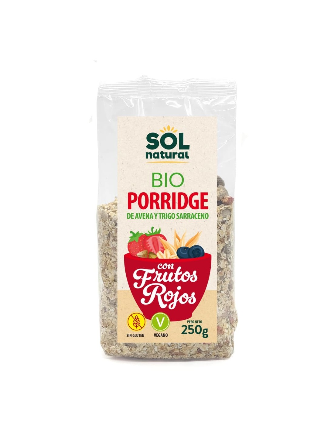 Der Porridge Red Fruits Oats and Buckwheat ECO 250 g von Solnatural ist ein gesundes und funktionelles Frühstück aus 100 % biologischen Zutaten. Seine Basis besteht aus glutenfreien Haferflocken (40%), gemahlenem Buchweizen (26%) und getrockneten Beeren wie Blaubeeren und Erdbeeren, angereichert mit Sonnenblumenkernen, gemahlenem braunen Leinsamen und Kokosblütenzucker.