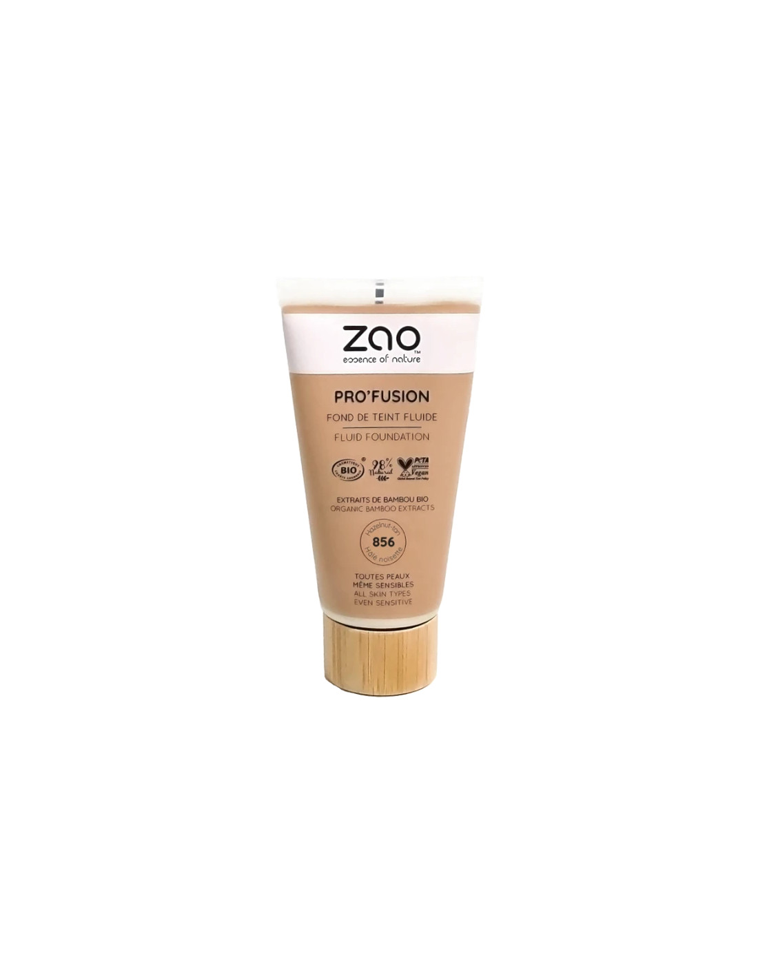 Pro'fusion ZAO Make Up Fluid Foundation im Farbton 856 - Hazelnut Tan: biologische und vegane Basis mit 98% natürlichen Inhaltsstoffen. Abdeckende und leuchtende Textur, die den Teint ausgleicht und die Haut atmen lässt.