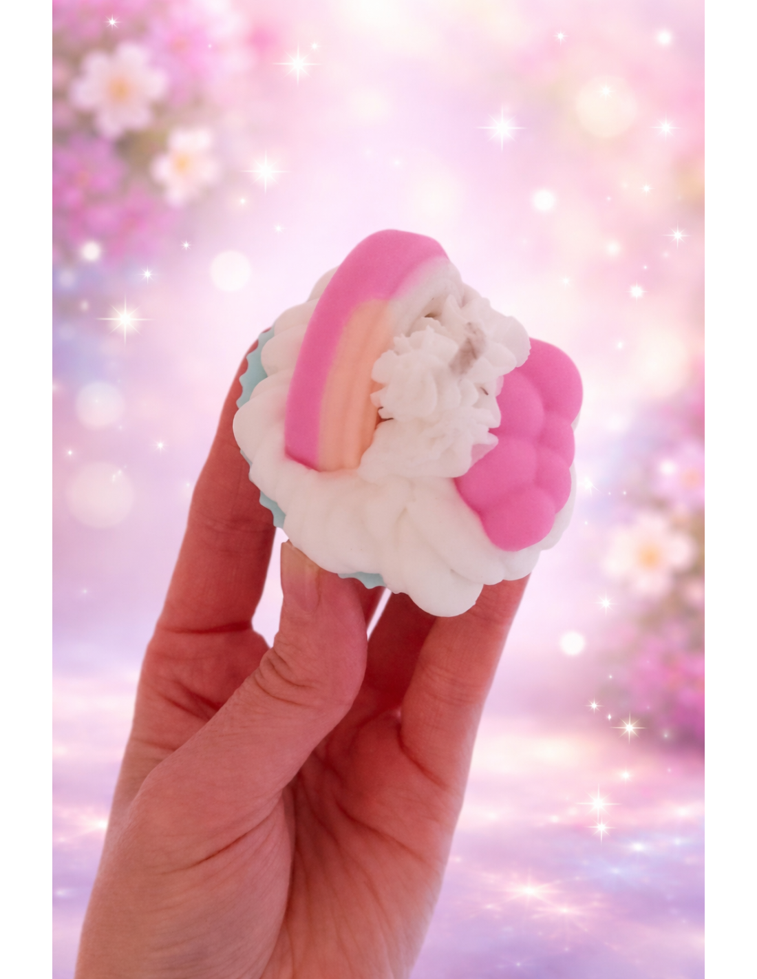 A RabudaHandgefertigte Dessertkerze aus Sojawachs, Baumwolldocht und mineralischen Farbstoffen, mit einem süßen Cupcake-Design, das sie zu einem einzigartigen dekorativen Detail macht.