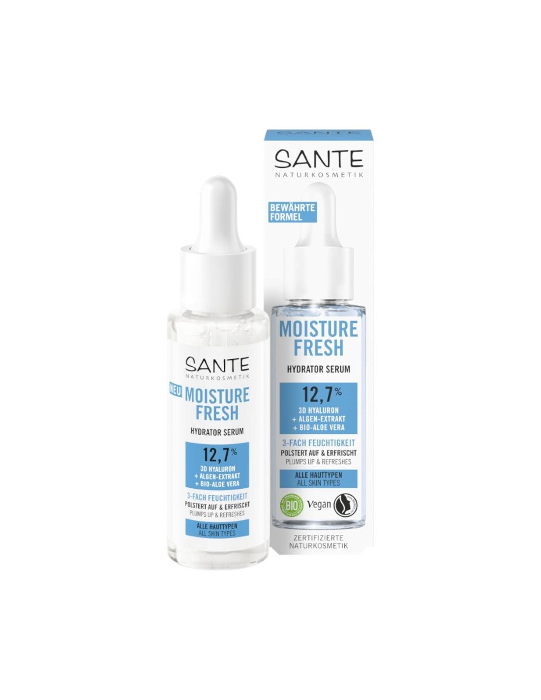 Ο Sante Moisture Fresh Moisturising Serum ενυδατώνει εντατικά, συσφίγγει και βελτιώνει την ελαστικότητα της επιδερμίδας με τριπλού βάρους υαλουρονικό οξύ, αλόη βέρα και εκχύλισμα φυκιών.