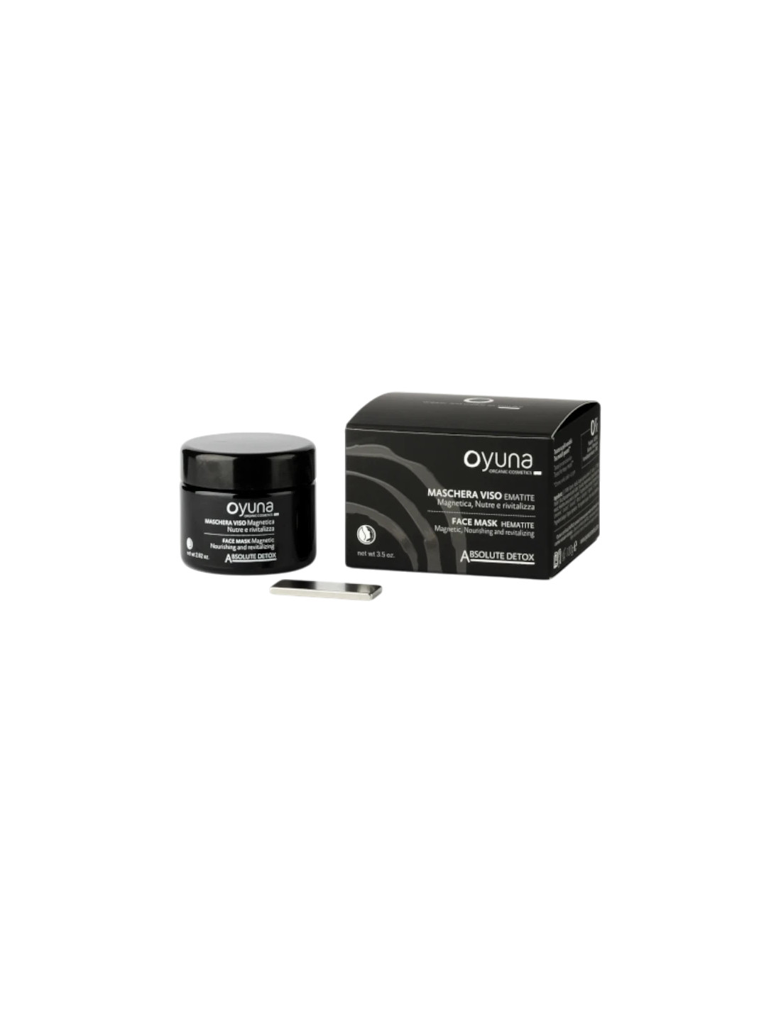 Oyuna Μαγνητική μάσκα προσώπου με αιματίτη (80 g): βιολογική και θρεπτική φόρμουλα που συνδυάζει έλαια αργκάν και ηλίανθου βιολογικής καλλιέργειας με εκχύλισμα αιματίτη για πιο λαμπερή και λεία επιδερμίδα.