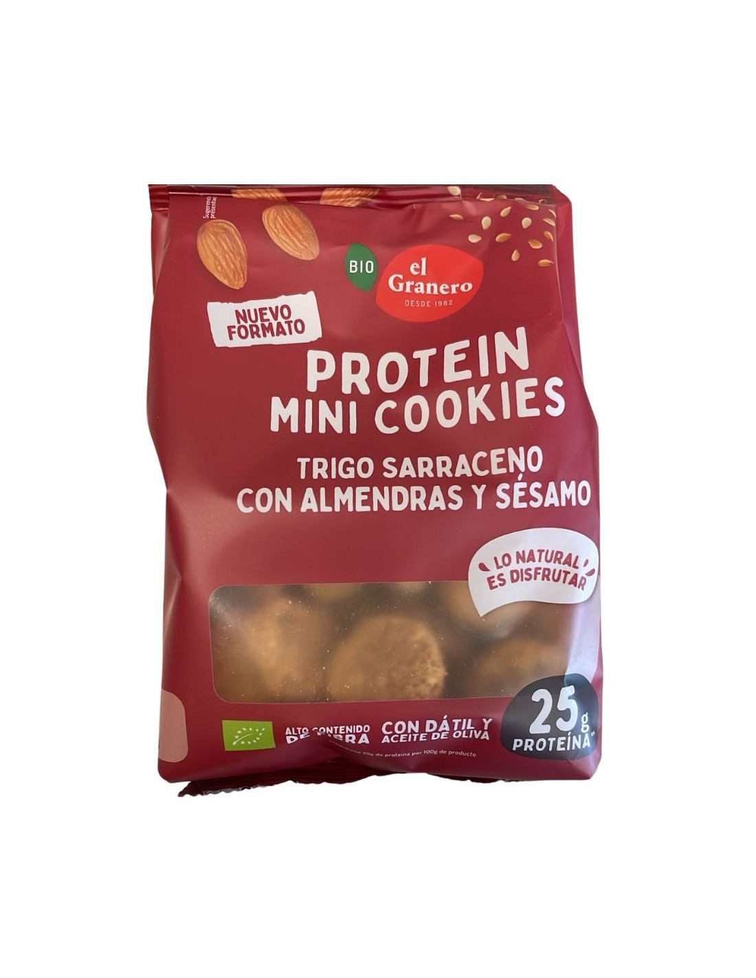 Τα μίνι μπισκότα Protein Sarraceno Almendra Sésamo Bio της El Granero Integral είναι ένα υγιεινό και θρεπτικό σνακ, ιδανικό για όσους αναζητούν μια φυσική πηγή πρωτεΐνης χωρίς να θυσιάζουν τη γεύση. Με 25% πρωτεΐνη ανά 100 γραμμάρια, αυτά τα μπισκότα είναι ιδανικά για αθλητές, δραστήριους ανθρώπους ή για οποιονδήποτε θέλει να φροντίζει τη διατροφή του με ισορροπημένο τρόπο.