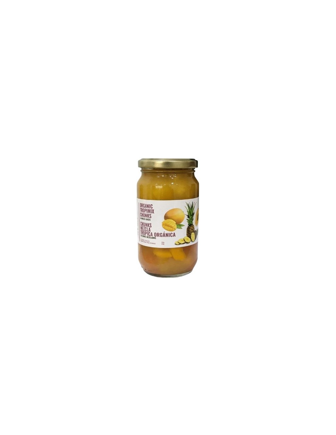 Τα κομματάκια φρούτων Maya's Tropical Blend Eco Fruit Chunks in Mixed Juice συνδυάζουν παπάγια, μάνγκο και ανανά βιολογικής καλλιέργειας, διατηρημένα σε έναν απαλό φυσικό χυμό που διατηρεί τη γεύση και την υφή τους.