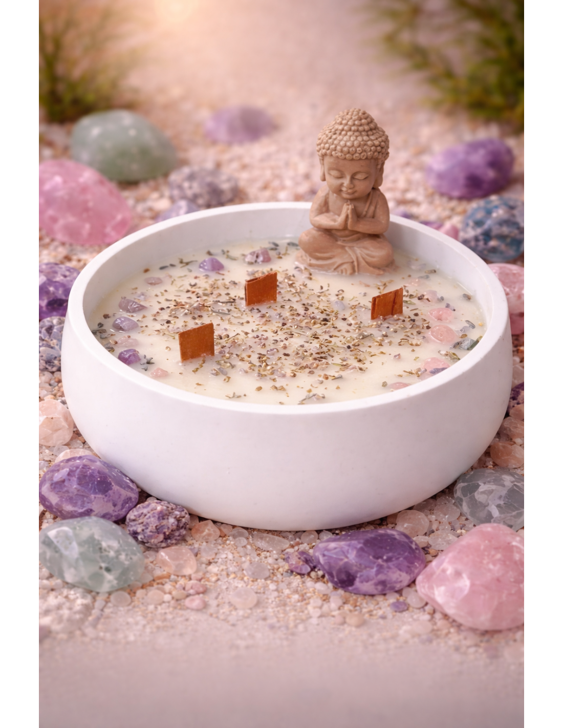 Είναι κατασκευασμένο με φυσικό κερί και προσεκτικά διακοσμημένο με βότανα και κρυστάλλους, στοιχεία που παραδοσιακά συνδέονται με την αρμονία και την ενεργειακή ισορροπία. Στο κέντρο του βρίσκεται μια φιγούρα του Βούδα σε στάση διαλογισμού, σύμβολο της γαλήνης, της συνειδητοποίησης και της εσωτερικής σύνδεσης. Το κερί παρουσιάζεται σε ένα δοχείο χειροποίητο από τον τεχνίτη με οικολογική ρητίνη, καθιστώντας κάθε κομμάτι μοναδικό και επαναχρησιμοποιήσιμο.