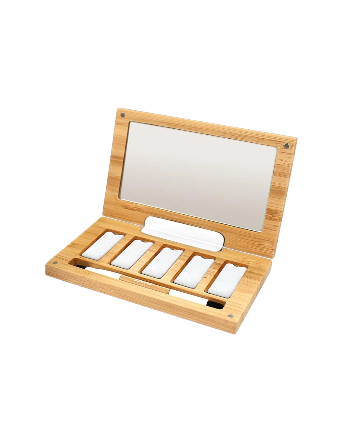 Bamboo Box Five (empty) by ZAO Make Up is a bamboo case with five slots designed to hold eyeshadows, eyebrow powders or other makeup refills in a compact format.