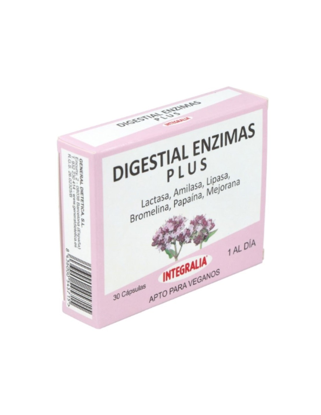 Digestial Enzymes Plus Vegan 30 capsules of Integralia is a food supplement formulated to support the digestive process through a direct supply of enzymes. During digestion, the body secretes acids and enzymes that allow the breakdown and assimilation of nutrients; however, in certain situations this capacity may be reduced, causing discomfort such as bloating or heaviness.