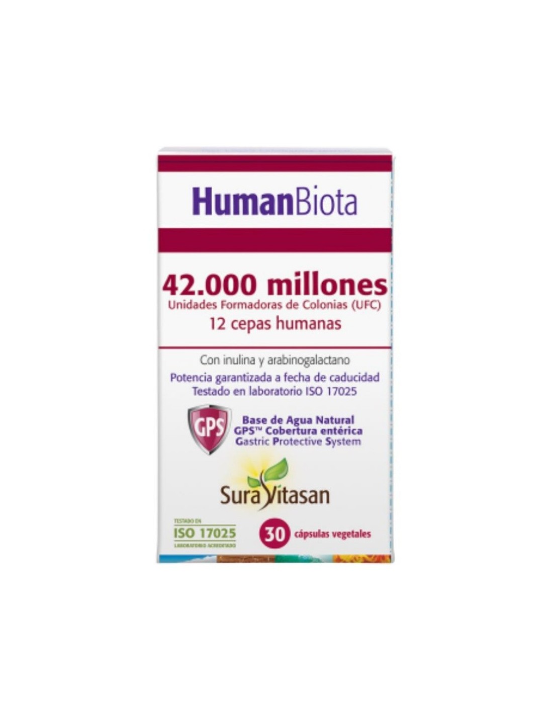 Human Biota Probiotics 42,000 million Bio from Sura Vitasan is a high potency food supplement that provides more than 42,000 million colony forming units (CFU) per capsule, from 12 probiotic strains of human origin. These strains are selected for their ability to colonize different areas of the gastrointestinal tract, contributing to the balance of the intestinal flora.