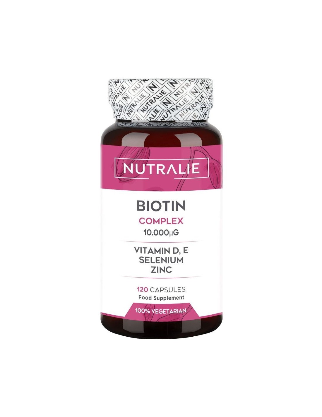 Biotin Complex from Nutralie is a food supplement that combines a high dose of biotin with selected vitamins and minerals. Its formulation includes biotin, zinc, selenium, vitamin D and vitamin E, nutrients involved in normal physiological functions related to the maintenance of hair, skin and nails.