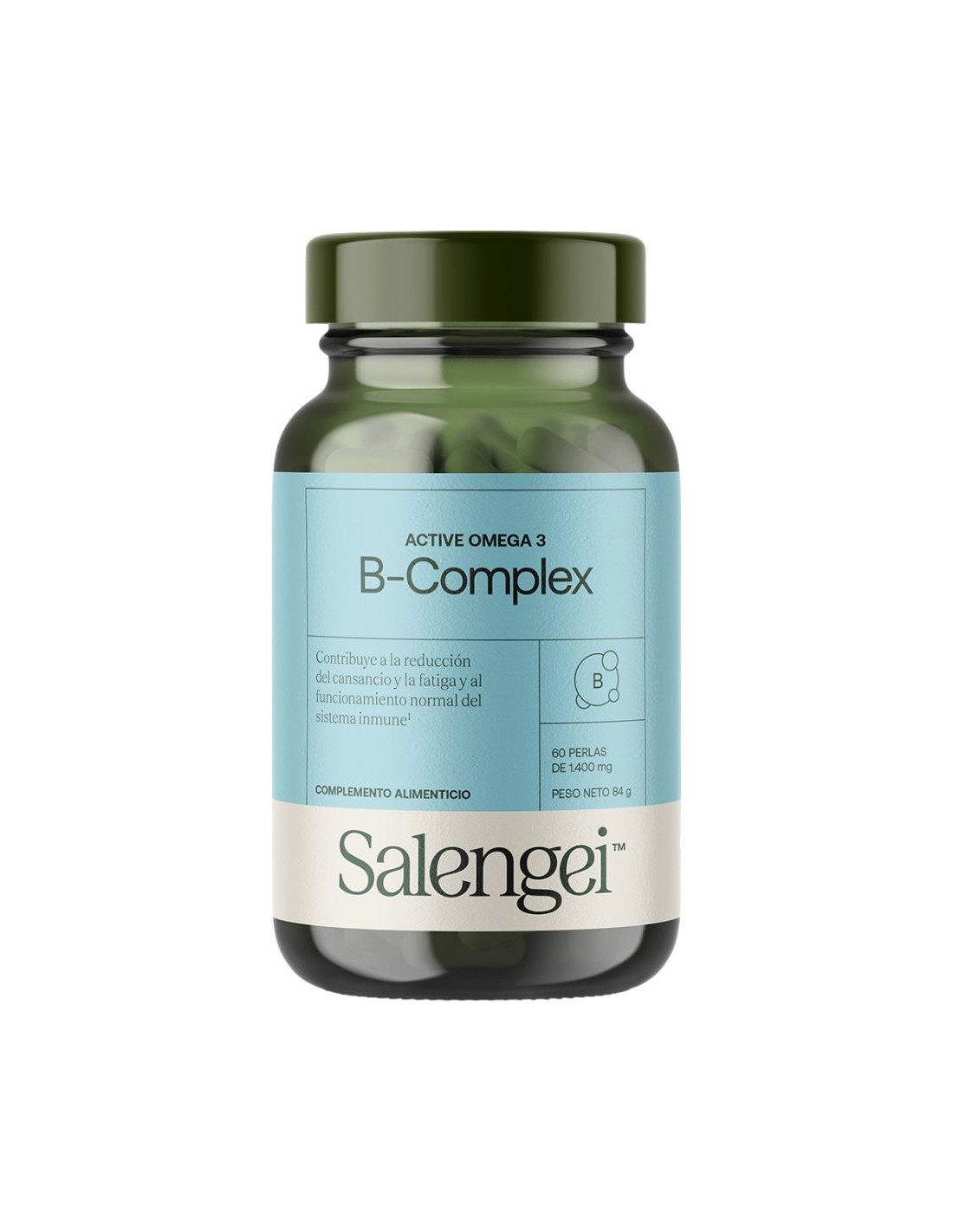 Active Omega 3 BComplex de Salengei combina en 60 perlas blandas una fuente de ácidos grasos omega-3 con un complejo de vitaminas B, diseñado como complemento a la alimentación habitual.