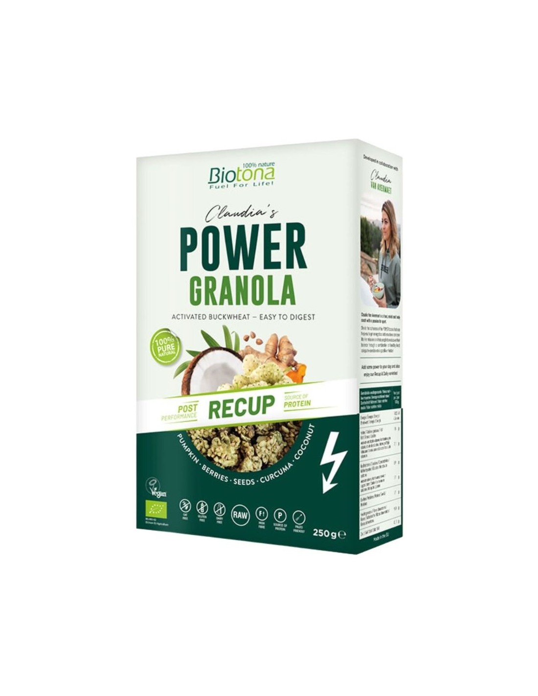 La Granola Power Recup Eco 250 g de Biotona es un muesli funcional diseñado para favorecer la recuperación después del esfuerzo físico y aportar energía en cualquier momento del día. Elaborada con ingredientes 100 % ecológicos, combina trigo sarraceno activado, semillas de calabaza, moras blancas secas, almendras, physalis en polvo y agua de coco en polvo, junto con superalimentos como la cúrcuma y la pimienta negra, que aportan beneficios adicionales.
