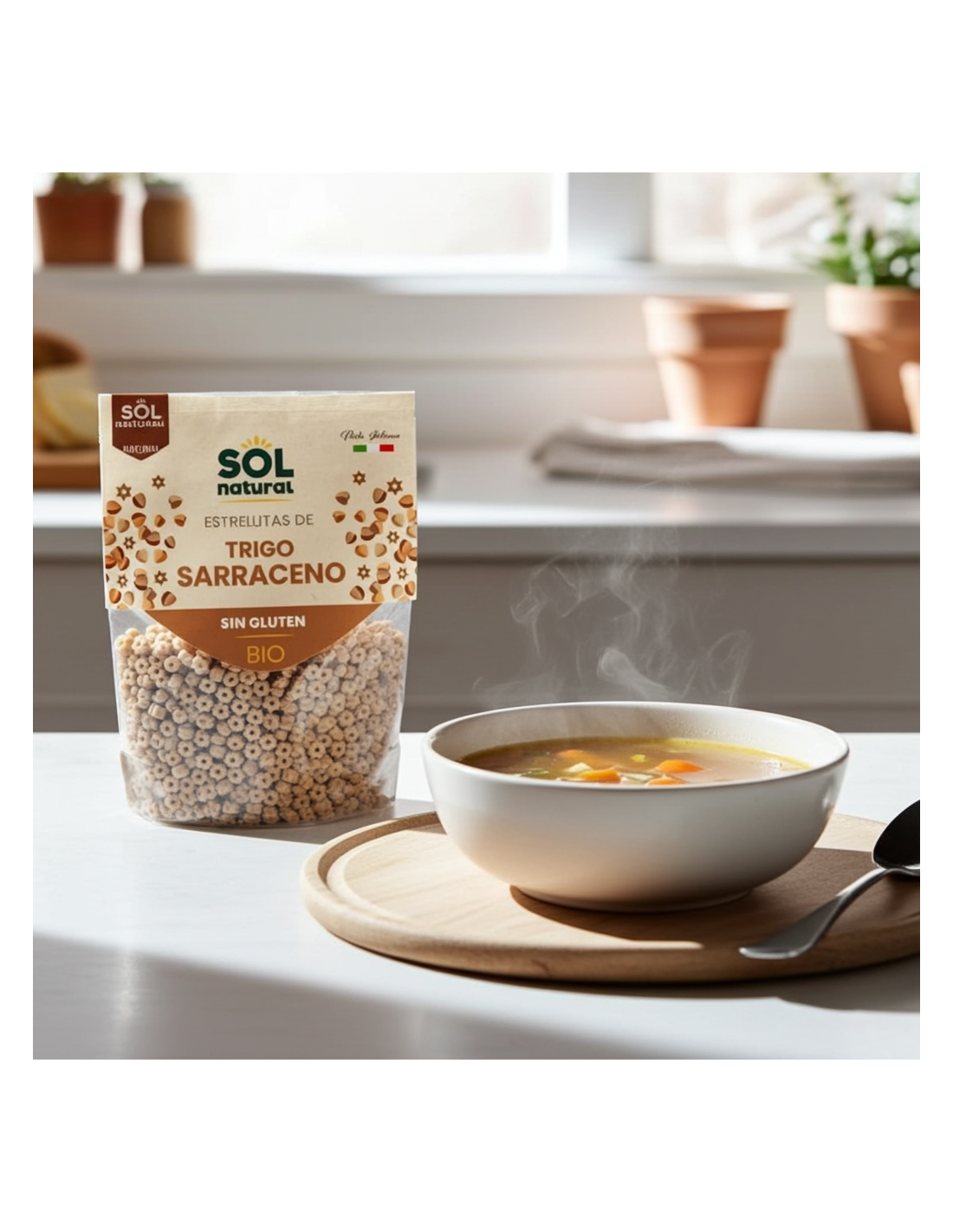 Las Estrellitas Trigo Sarraceno SinGluten 250 g de Solnatural son una alternativa saludable a la pasta convencional, especialmente pensada para quienes siguen una dieta libre de gluten. Elaboradas únicamente con harina de trigo sarraceno ecológico y agua, estas estrellitas aportan nutrientes esenciales y un sabor suave con notas ligeramente a nuez.