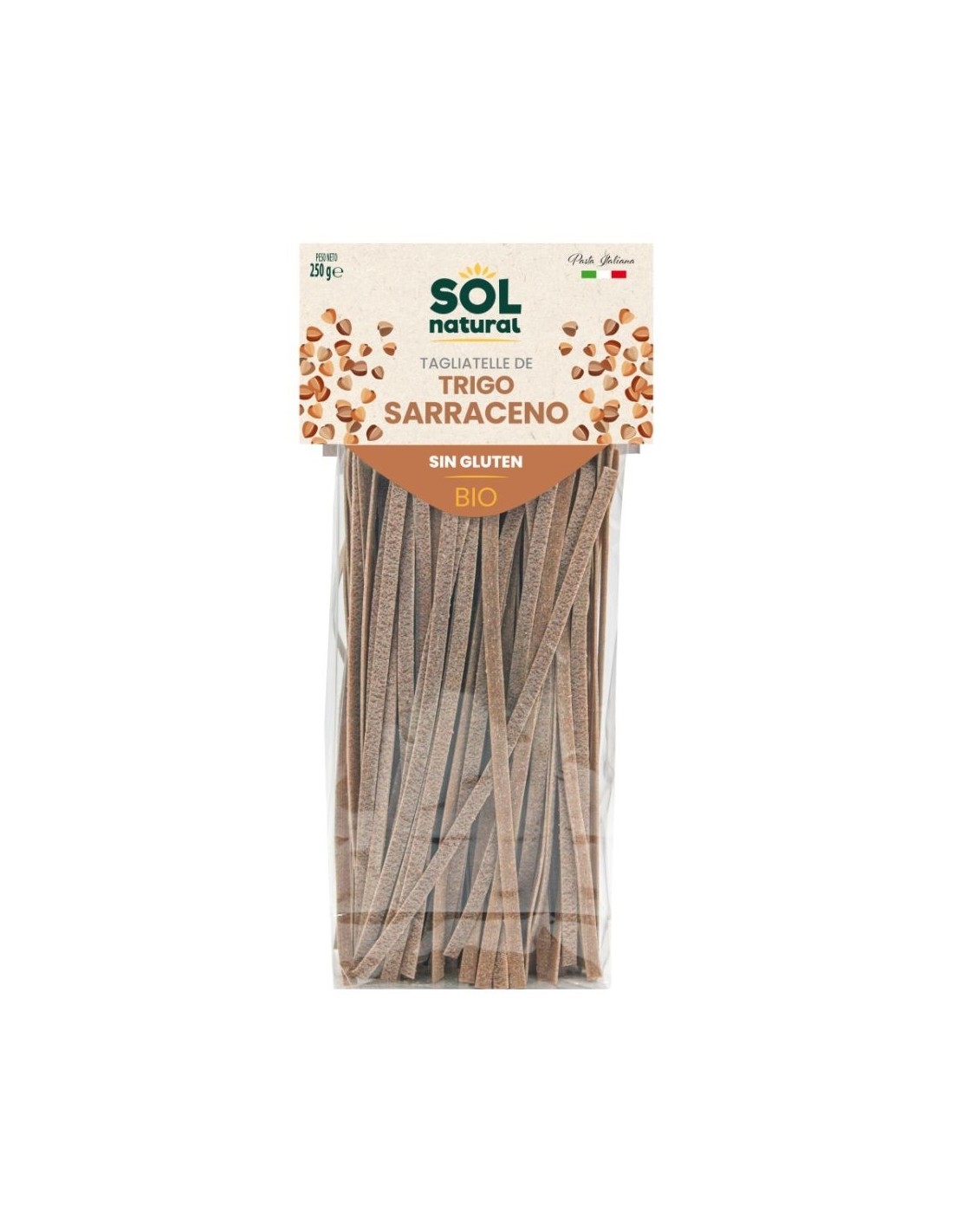 Los Tallarines Trigo Sarraceno SinGluten 250 g de Solnatural son una pasta nutritiva y saludable, elaborada exclusivamente con harina de trigo sarraceno ecológico y agua. Este pseudocereal, naturalmente libre de gluten, aporta un sabor suave y terroso, además de una textura firme que se mantiene tras la cocción.