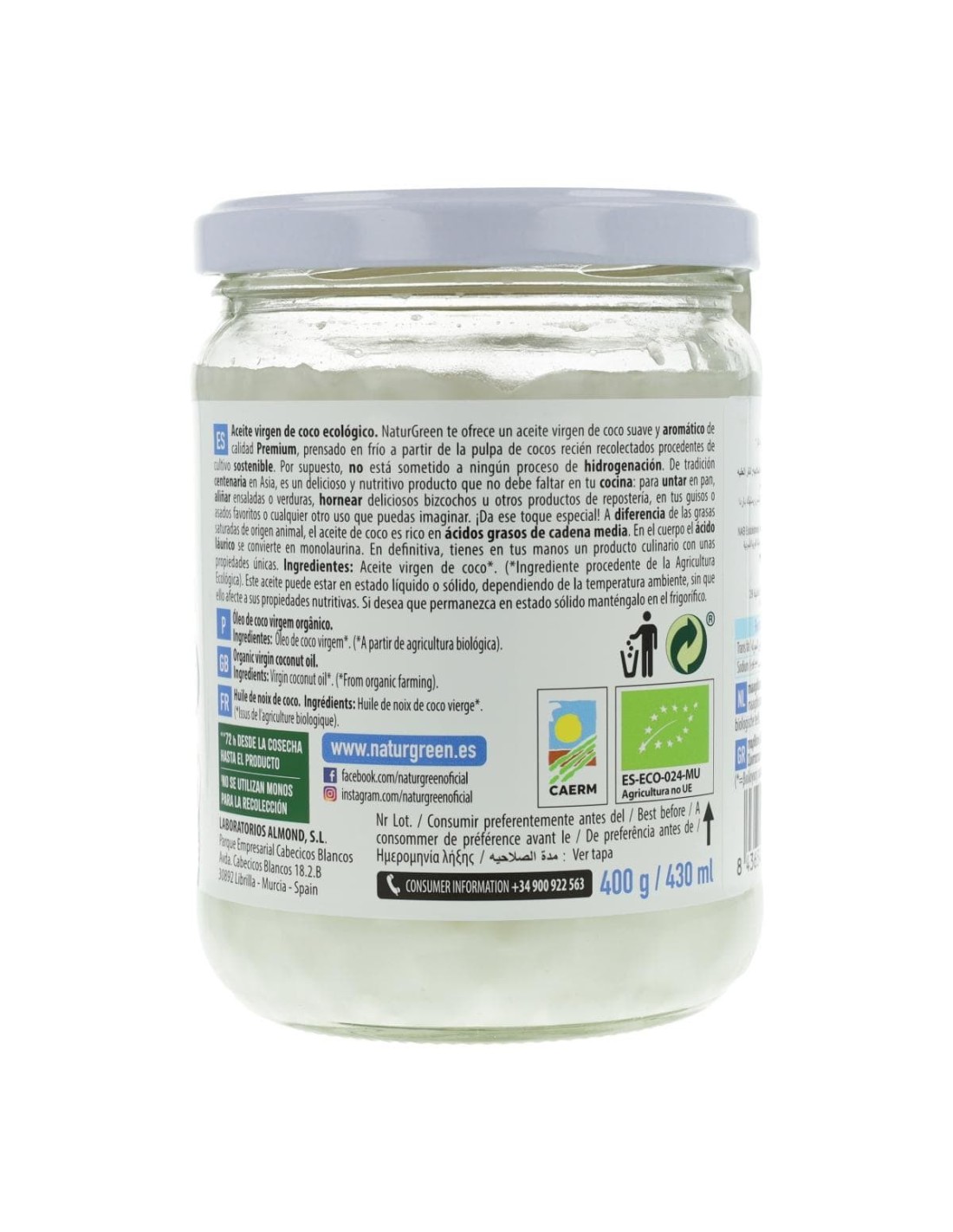 El Aceite de Coco Virgen Vegan Bio 430 ml de NaturGreen es un aceite de primera calidad, extraído mediante prensado en frío de cocos frescos procedentes de cultivos sostenibles. Este método garantiza que sus propiedades nutricionales —como ácidos grasos esenciales y antioxidantes naturales— se mantengan intactas.