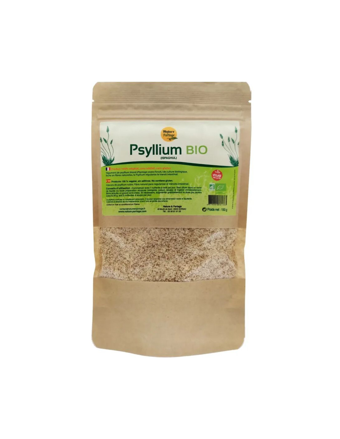 Psyllium Ispaghul Eco 150g Nature et Partage presenta cáscara de psyllium de cultivo ecológico en un formato práctico de 150 g. Textura fina y sabor neutro que se hidrata rápidamente.