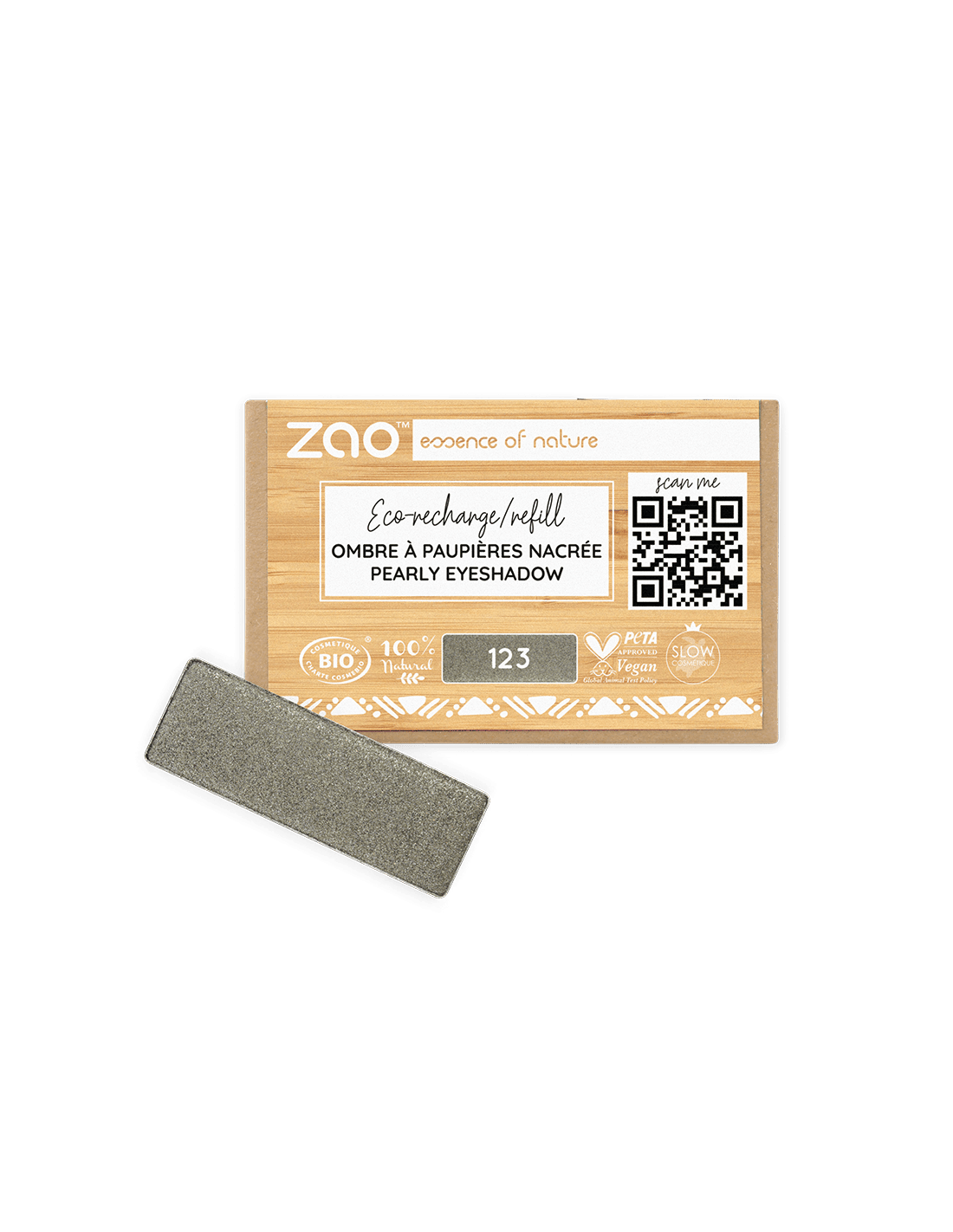 Recarga de sombra nacarada ZAO Make Up, tono 123 Gris Kaki: un gris con matiz kaki y acabado perlado que aporta luminosidad y profundidad a la mirada.