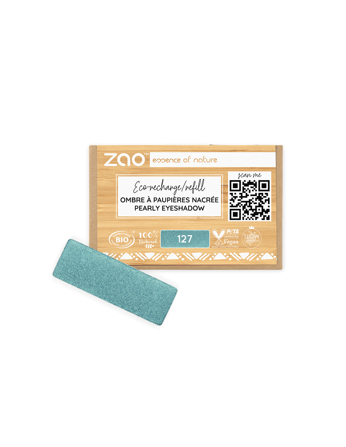 Recarga de sombra nacarada ZAO Make Up 127 Bleu Paon: tono azul pavo real con brillo irisado, diseñada como recambio para paletas recargables.