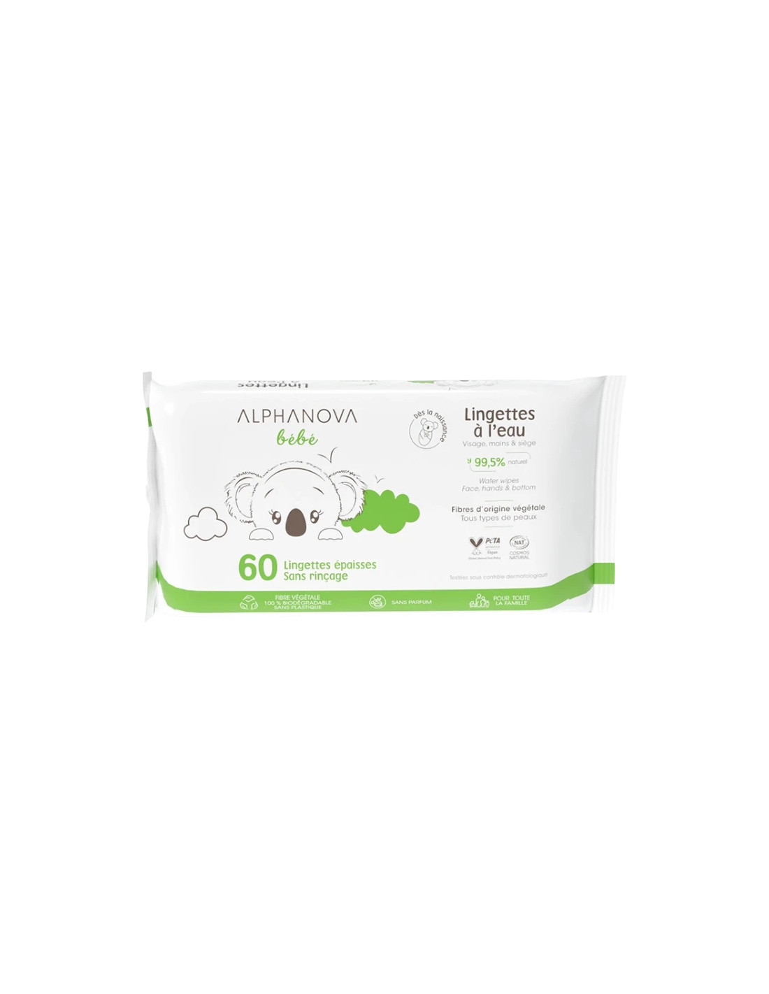 Toallitas de bebé certificadas COSMOS Natural por Alphanova, pack de 60 unidades diseñadas para la higiene diaria de la piel delicada.