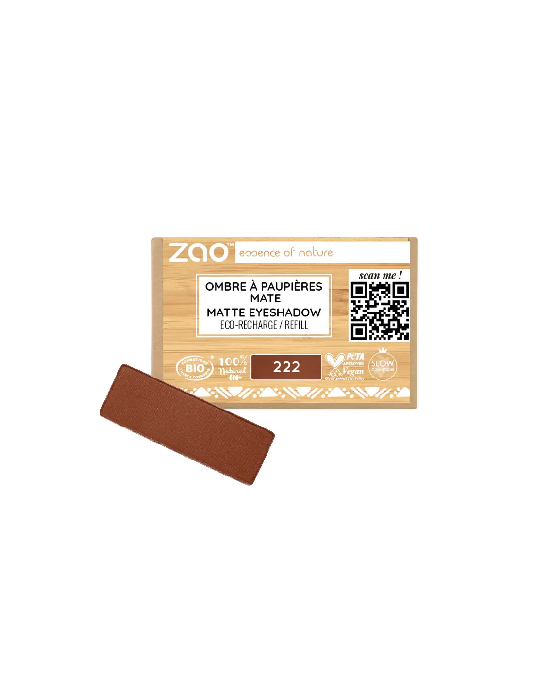 La recarga Sombra Mate 222 Brun pourpre de ZAO Make Up ofrece un acabado totalmente mate en un tono marrón con matiz púrpura, pensado para añadir calidez y sutileza a cualquier look.