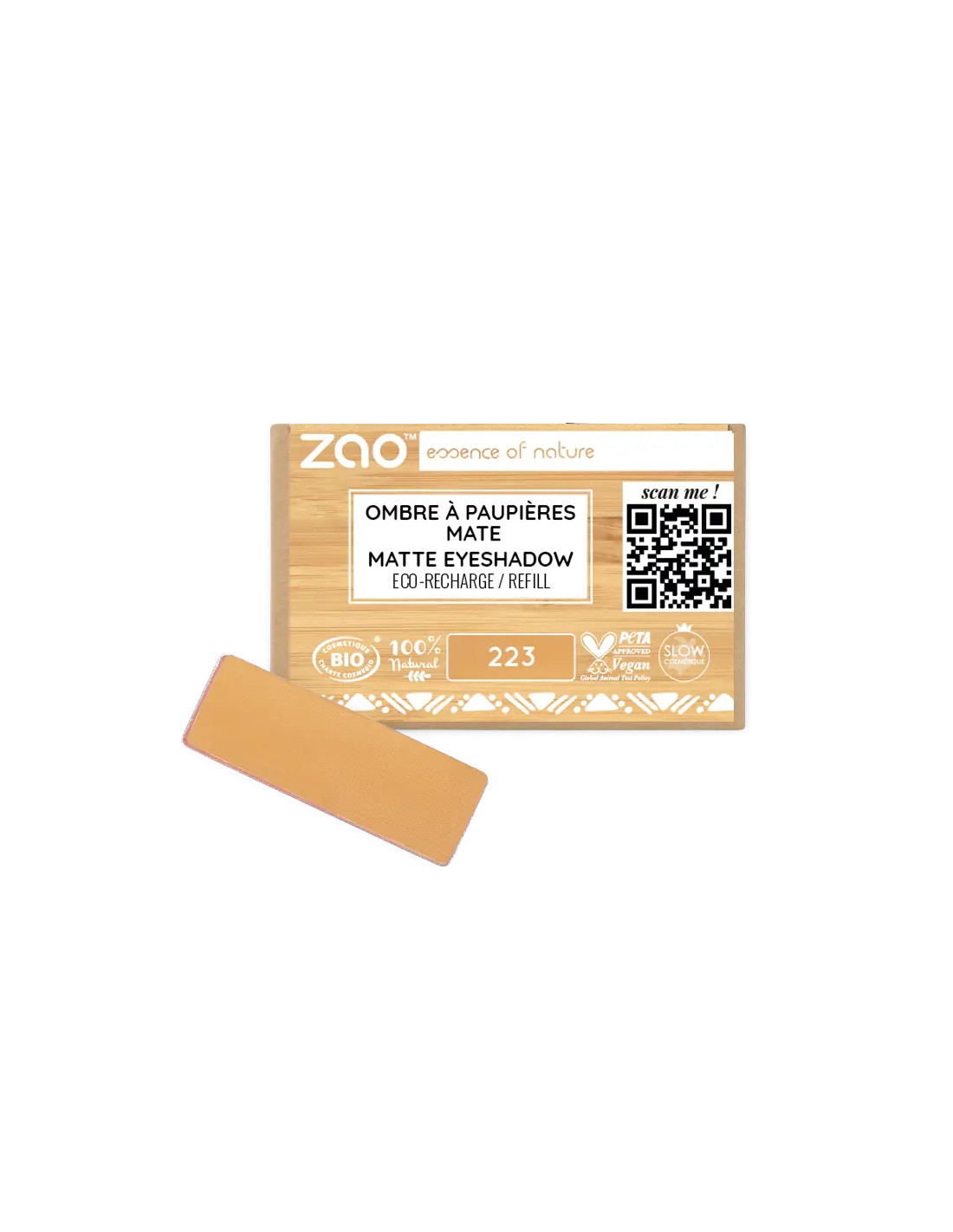 Recarga de sombra mate ZAO Make Up en tono 223 Camel: un beige cálido y versátil con acabado completamente mate. Formato recarga pensado para paletas ZAO, perfecto para personalizar tu selección de sombras.