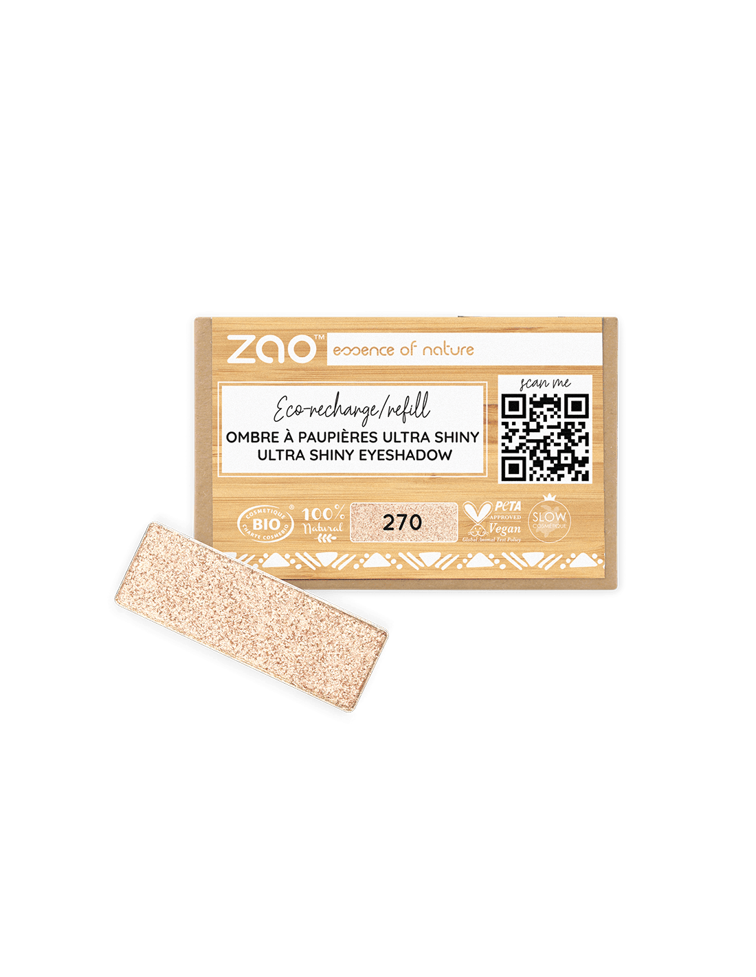 Recarga Sombra Ultra Shiny 270 Champagne de ZAO Make Up: sombra en formato recambio con un acabado ultra brillante y tono champán perlado, ideal para aportar luz y reflejos elegantes.