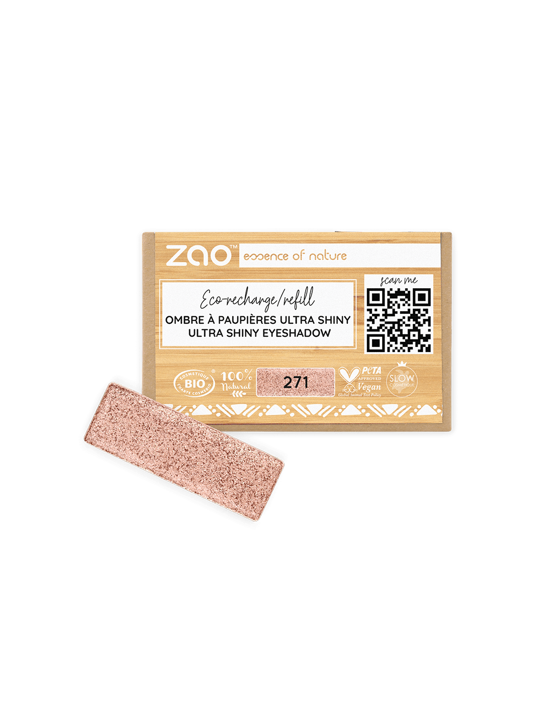 Zao Recarga Sombra Ultra Shiny 271 Cuivre Rosé ofrece un tono cobre con matices rosados y un acabado ultra brillante pensado para aportar luminosidad al párpado.