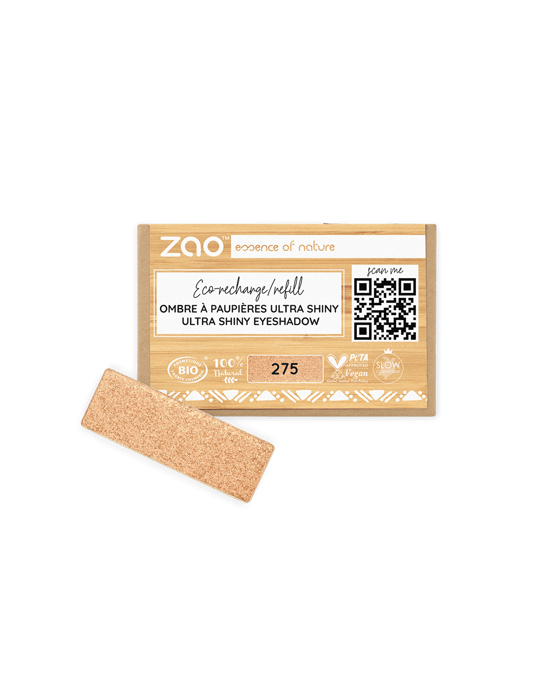 ZAO Make Up Recarga Sombra Ultra Shiny 275 Orange Doré ofrece un color naranja con reflejos dorados y un acabado ultra brillante que aporta luminosidad al maquillaje de ojos.