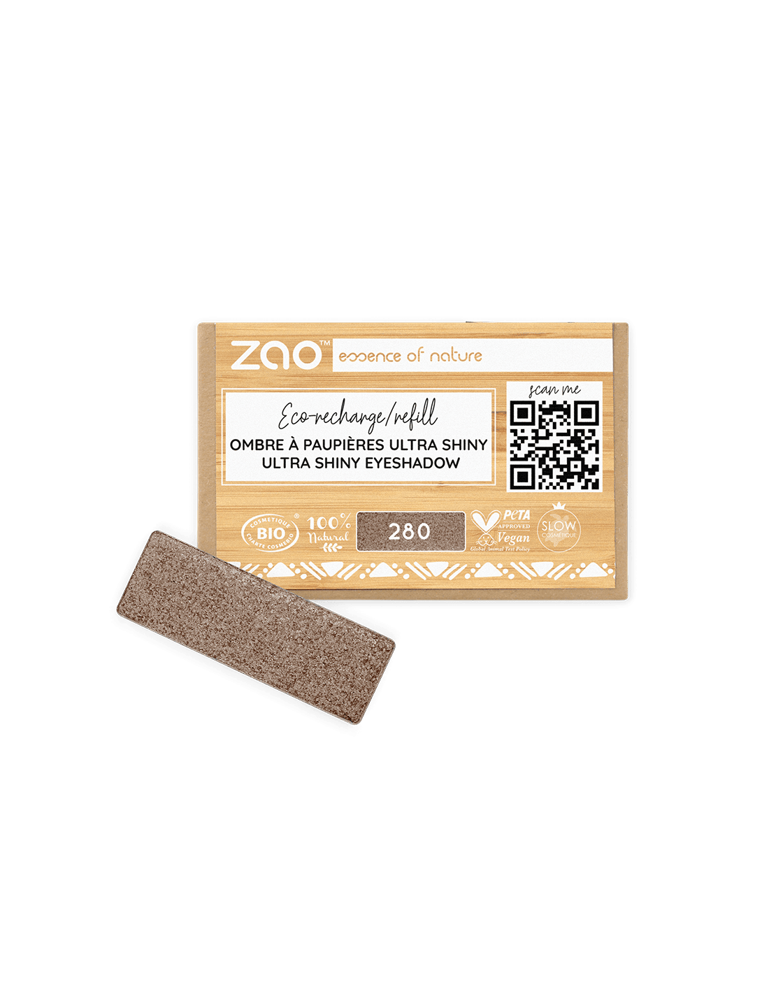 Recarga de sombra ZAO Ultra Shiny en el tono 280 Cacao Satin: un marrón cálido con acabado satinado y brillo sutil para aportar luminosidad a la mirada.