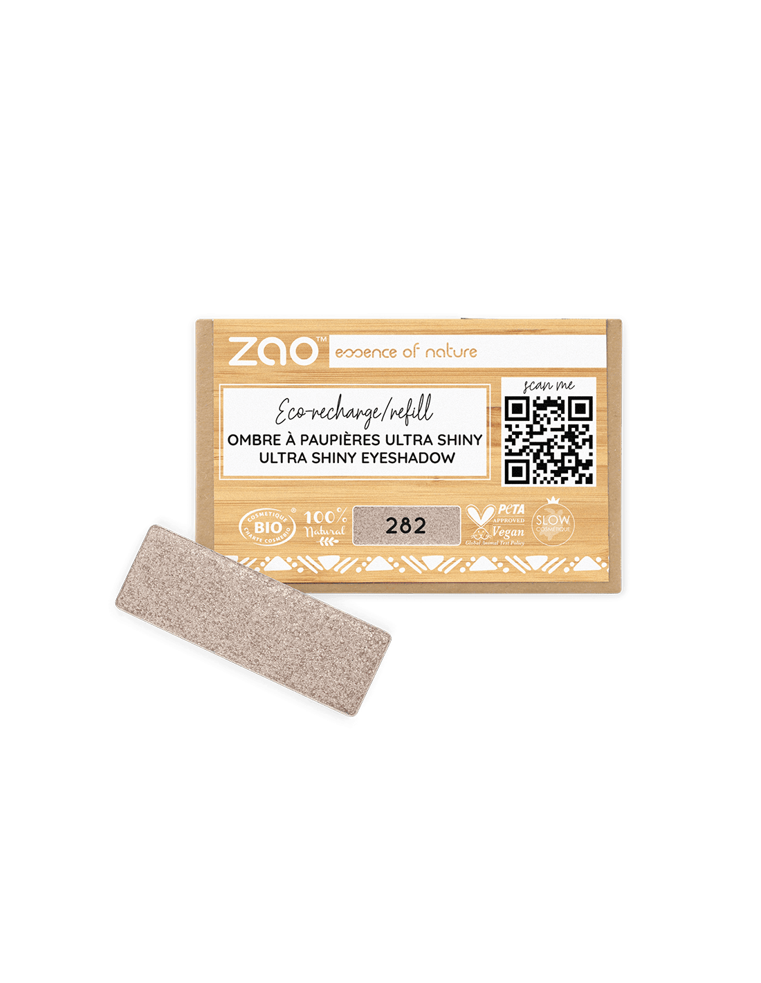 Formato recargable compatible con paletas ZAO; textura modulable para aplicar en seco o con pincel humedecido y crear looks luminosos y sofisticados.