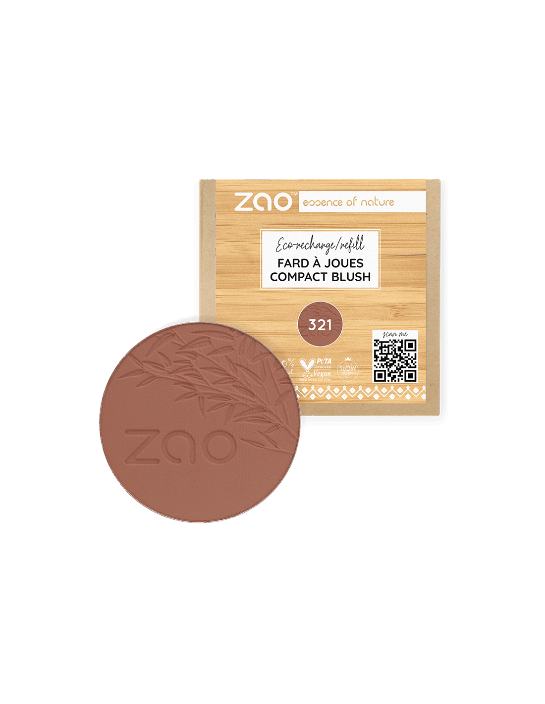 Recarga Colorete Compacto ZAO Make Up en el tono 321 Brun Orangé. Polvo prensado en formato recarga diseñado para inserción en estuches compactos compatibles.