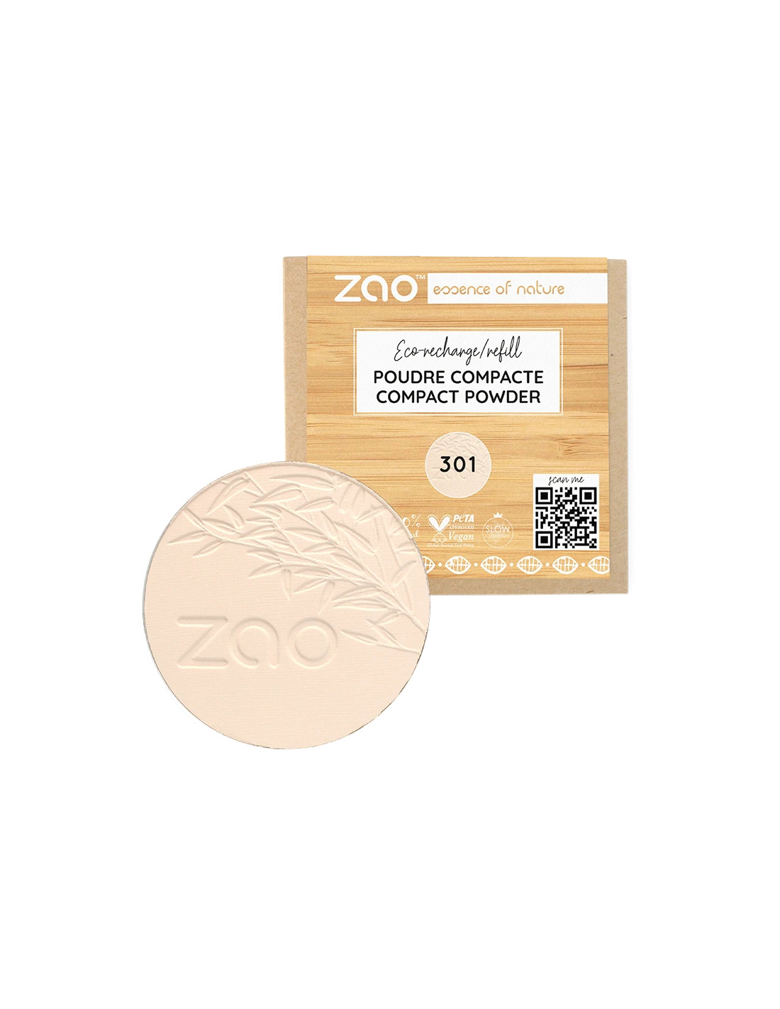 Recarga de polvo compacto ZAO Make Up en el tono 301 Ivoire, indicada para pieles claras. Formato refill diseñado para reponer el contenido del estuche recargable ZAO.