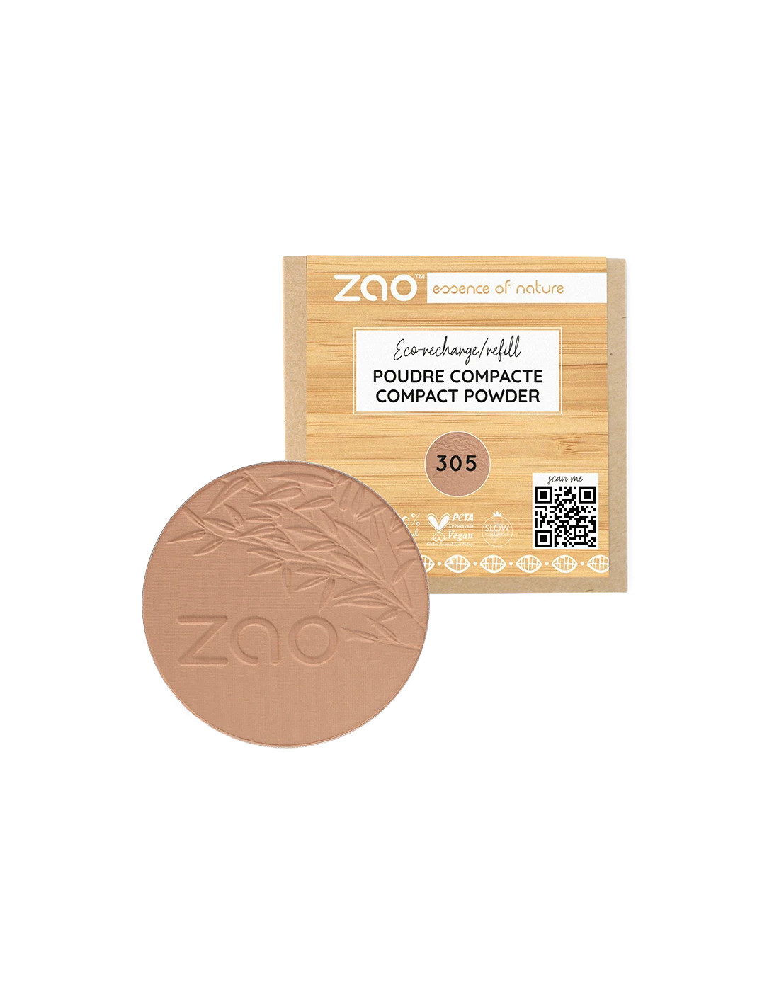 Zao Recarga Polvo Compacto 305 - Chocolat au Lait es una recarga de polvo compacto en el tono 305, pensada para integrarse en estuches recargables compatibles de la marca. Presenta un tono cálido y versátil para pieles que buscan un efecto natural.