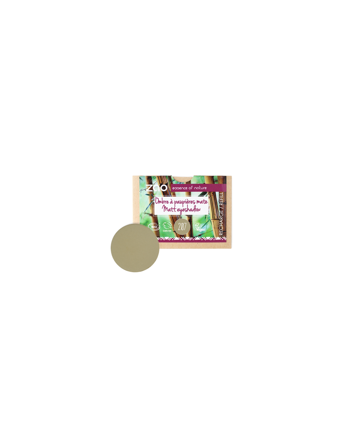 Producto: Recarga de sombra mate ZAO Make Up, tono 207 Vert Olive, en formato redondo (pan) para insertar en paletas recargables.