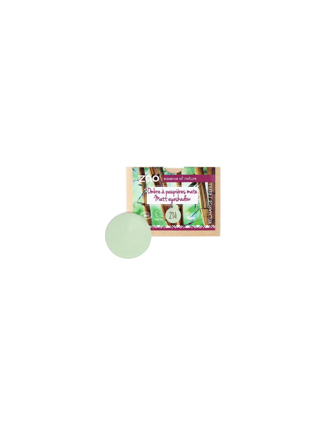 Zao Recarga Sombra Mate 214 - Vert D'eau es una sombra en polvo compacto con acabado mate, presentada en formato recarga redonda pensada para paletas recargables.