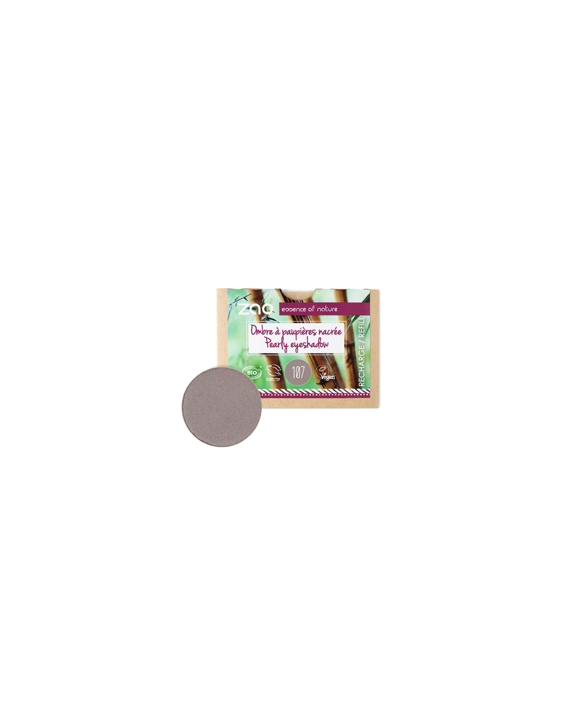 Producto: Recarga de sombra nacarada ZAO Make Up, referencia 107 Brun Gris. Formato redondo pensado como recarga para paletas de la marca.