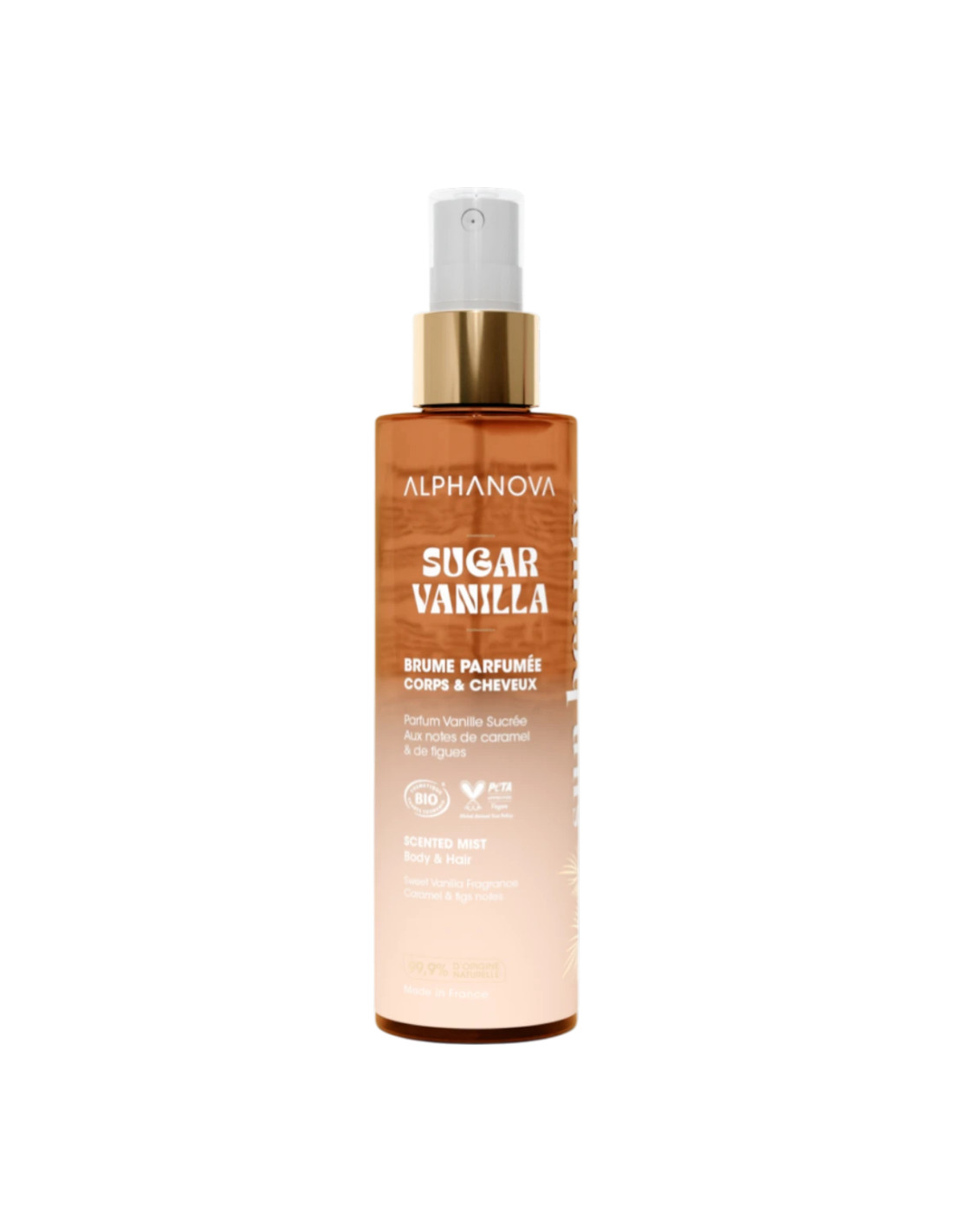 Bruma para cabello y cuerpo Alphanova con delicado aroma a vainilla. Formato 100 ml, formulada como cosmético bio para perfumar y refrescar con una textura ligera.