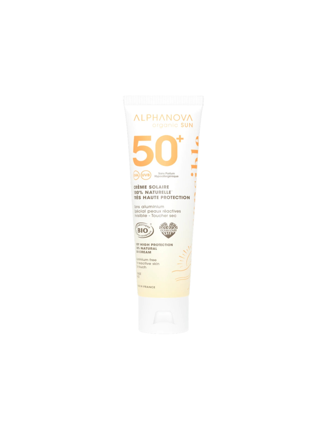 Crema solar SPF50+ diseñada para pieles sensibles. Formato práctico de 50 g con certificación BIO para una protección alta frente a la radiación solar.