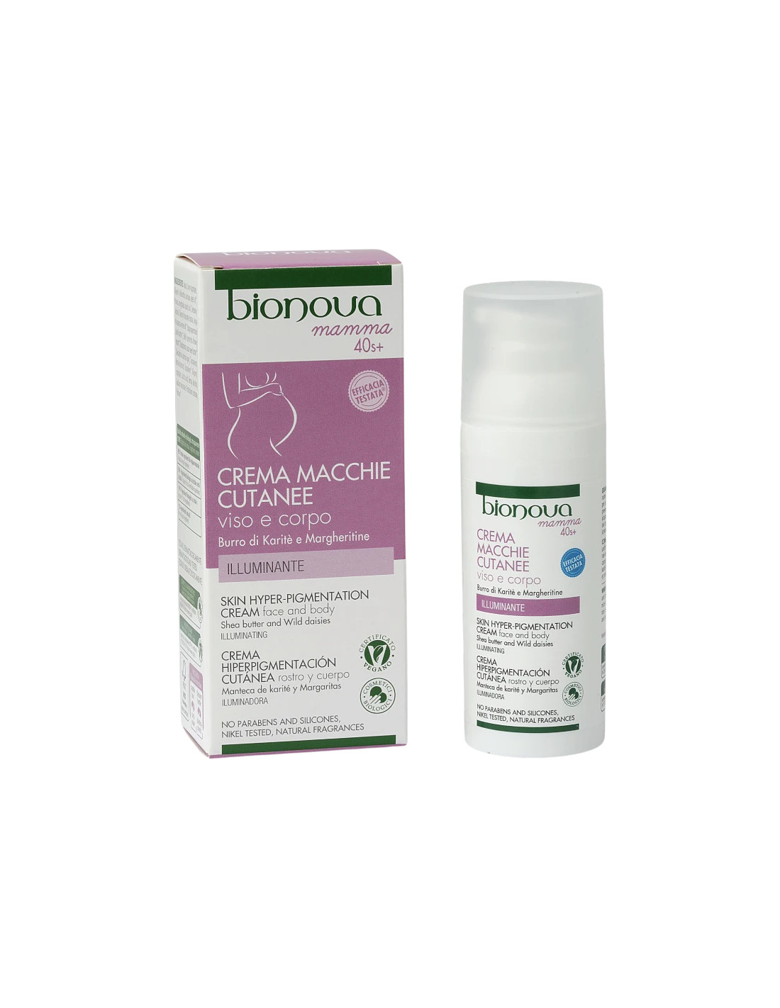 Crema facial anti-pigmentación Bionova con manteca de karité y extracto de margarita en formato 50 ml. Fórmula pensada para ayudar a unificar el tono y atenuar la apariencia de manchas.