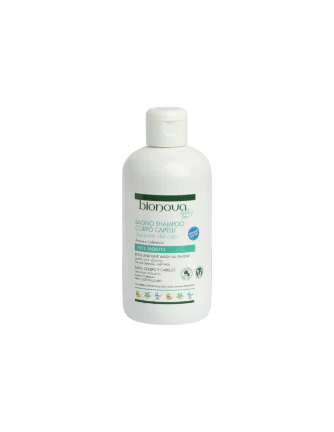 Gel 2 en 1 para cuerpo y cabello Bionova con avena y caléndula: limpieza diaria suave que respeta la piel y el cabello. Textura cremosa y espuma delicada.