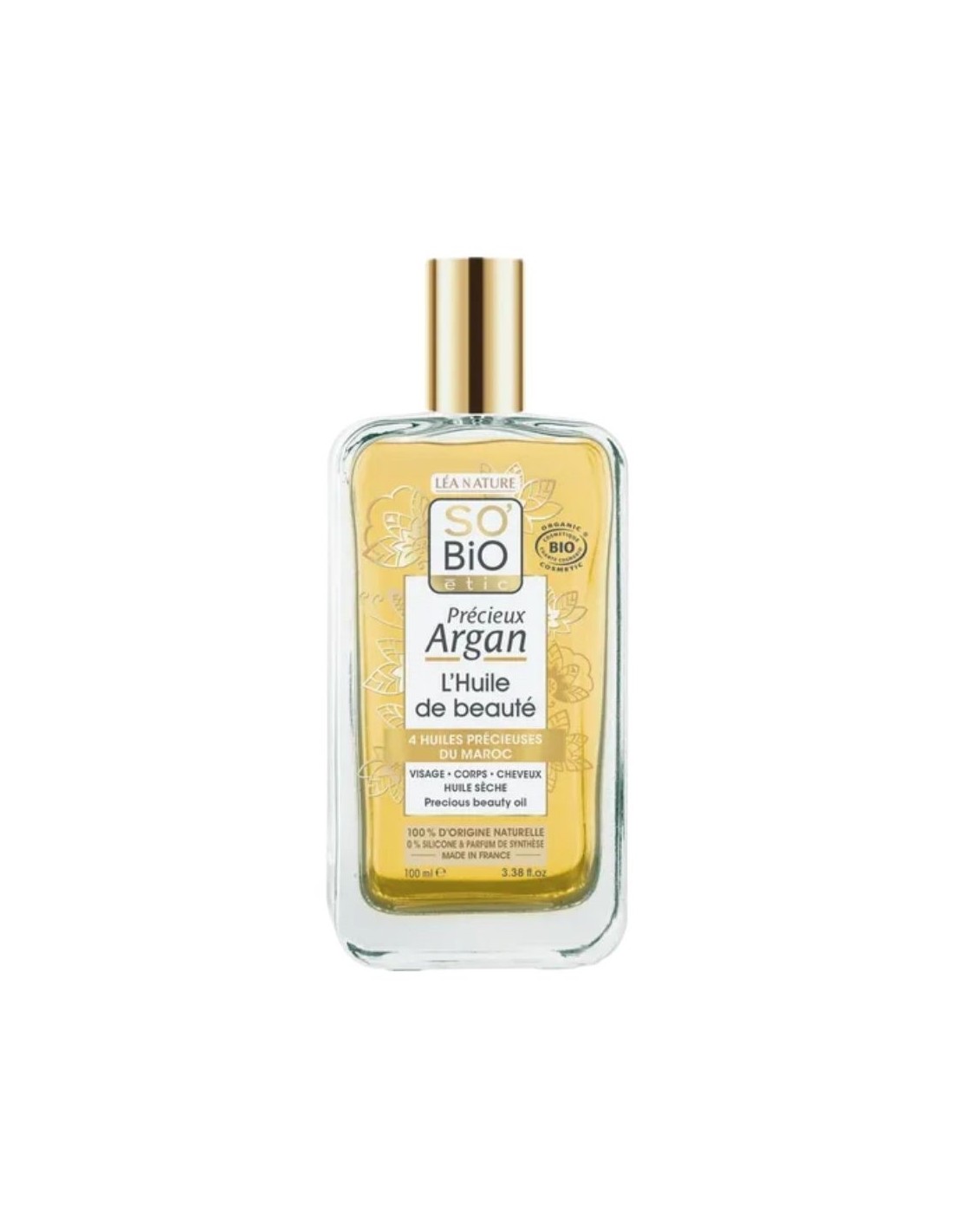 El Aceite de Argán Belleza Bio de So’Bio Étic es un elixir natural que combina la riqueza de cuatro aceites marroquíes ecológicos —argán, nopal, rosa damascena y siempreviva— para nutrir, regenerar y sublimar la piel y el cabello. Su textura de aceite seco se absorbe rápidamente sin dejar sensación grasa, aportando confort, suavidad y un acabado satinado.