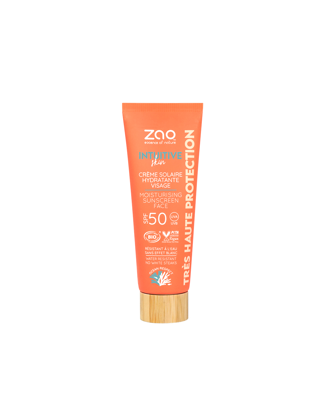 Zao Make upProtector solar facial ecológico SPF50 que hidrata intensamente y ofrece una protección muy alta frente a los rayos UVA y UVB, respetando incluso las pieles más sensibles.
