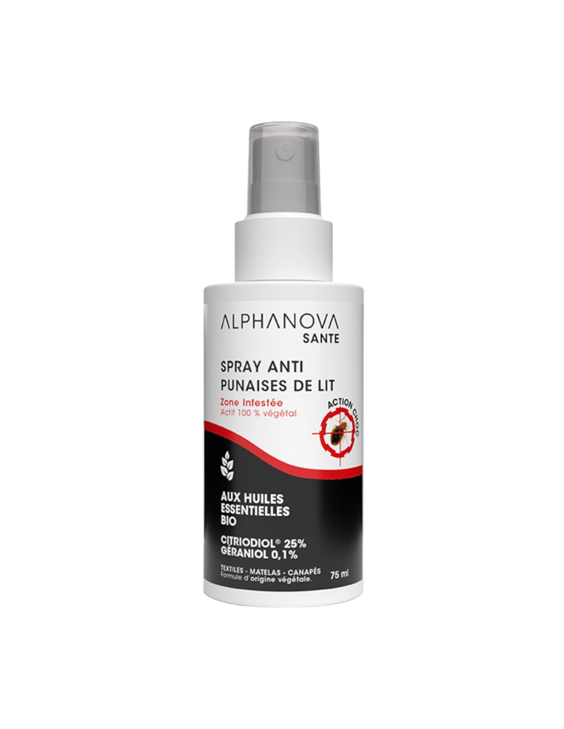 Spray repelente de chinches Alphanova, envase de 75 ml pensado para aplicaciones puntuales en el hogar y en desplazamientos. Su formato en spray facilita el tratamiento de zonas concretas sin necesidad de grandes cantidades de producto.