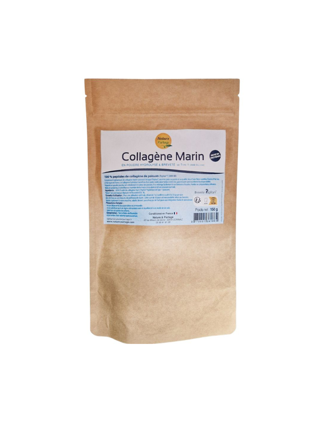 Colágeno marino en polvo, presentación práctica de 150 g de Nature et Partage. Textura fina y sabor neutro pensado para integrarse sin esfuerzo en bebidas y recetas.
