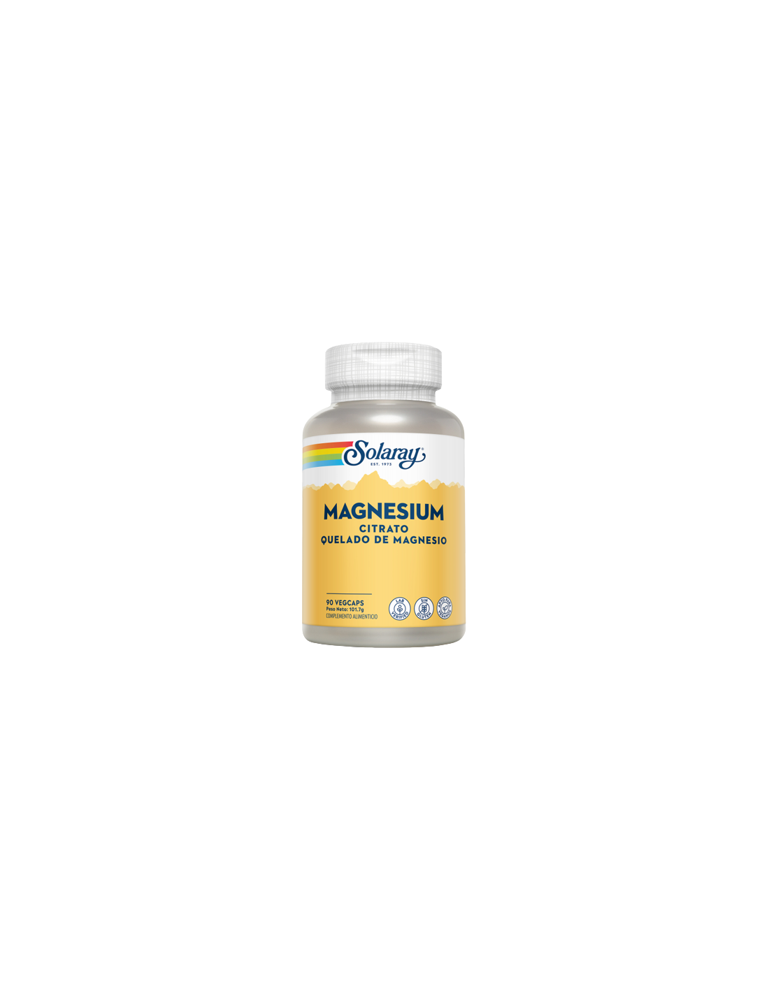 Magnesium Citrato Quelado de Magnesio SinGluten Vegan 90 cápsulas de Solaray es un complemento alimenticio que aporta magnesio en forma de citrato de magnesio, junto con una mezcla de ingredientes vegetales como hoja de perejil, alfalfa, berro y raíz de diente de león.