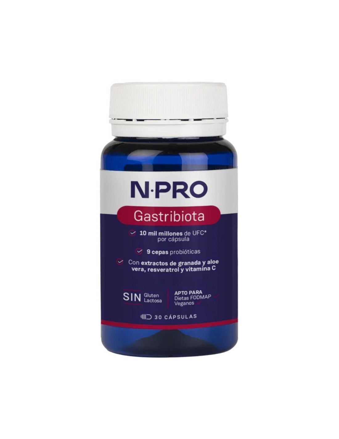 Gastribiota de NPro es un complemento alimenticio que combina cepas probióticas, extractos vegetales y vitamina C.