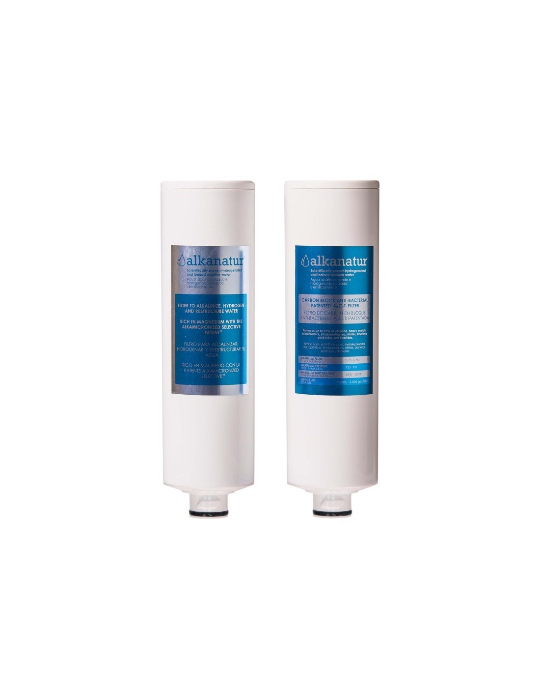 Alkanatur Depure -täydennyspakkaus, joka koostuu kahdesta patruunasta: antibakteerinen hiililohkosuodatin ja remineralisoiva alkalisoiva ionisoiva suodatin. Takaa veden täydellisen puhdistuksen, antaa magnesiumia ja parantaa sen laatua, makua ja rakennetta.