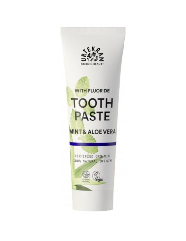 Urtekramin Eco Vegan Mint Aloe Fluoride Toothpaste 75ml on ihanteellinen valinta niille, jotka etsivät luonnollista suuhygieniaa fluorin tehokkuudella. Sen COSMOS Organic -standardin mukaisesti sertifioitu luomukaava yhdistää huolellisesti valitut ainesosat, jotka tarjoavat syvän, virkistävän ja kunnioittavan puhdistuksen hampaille ja ikenille.