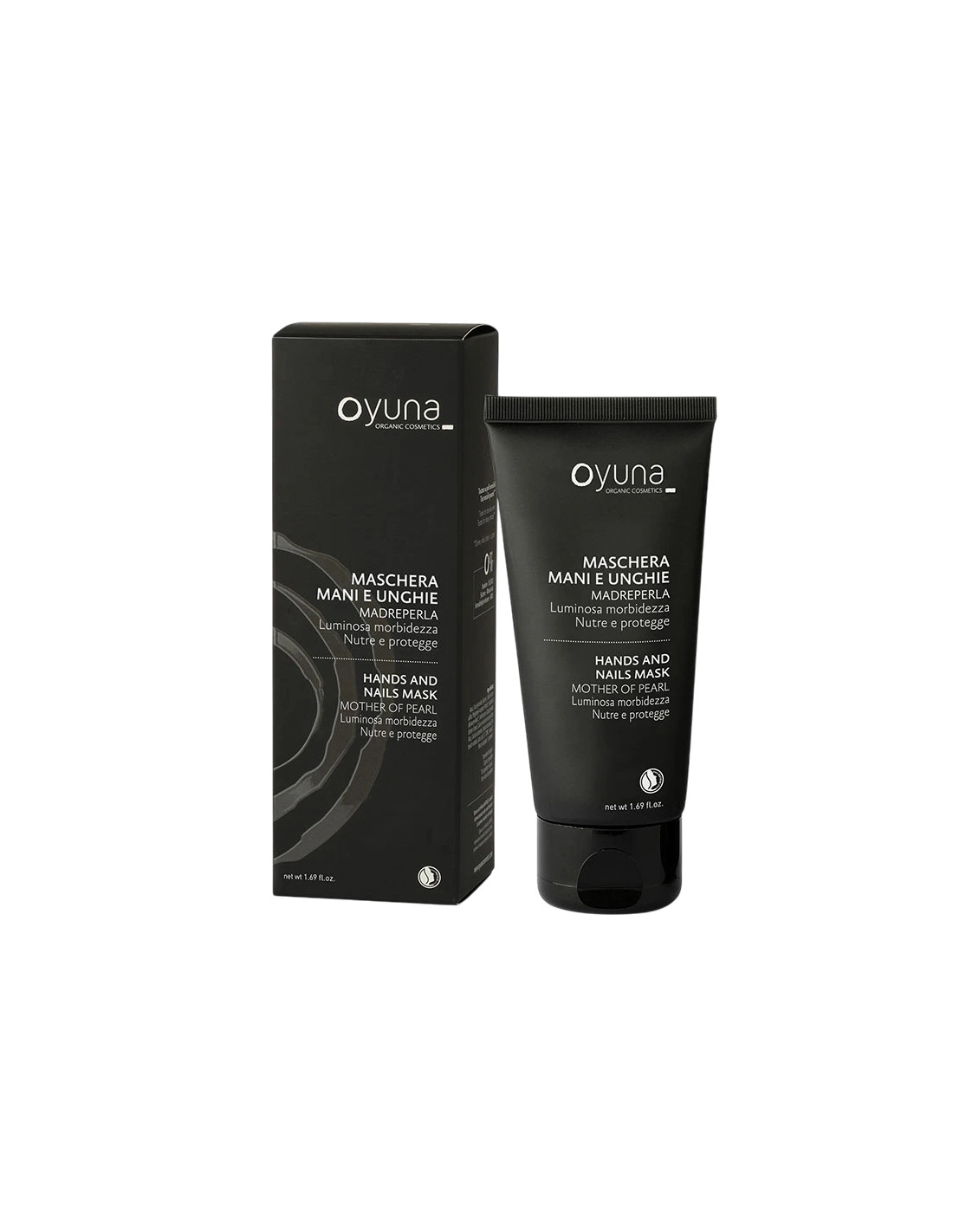 OYUNA Madreperla -käsinaamio, NATRUE-sertifioitu luomuhoito 50 ml:n pakkauksessa, joka antaa absoluuttista kiiltoa ja syvää ravintoa helmiäisen ja karitevoin ansiosta.