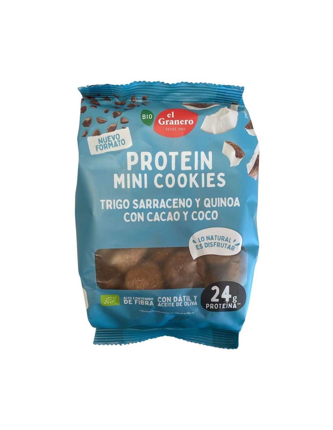 El Granero Integralin Mini Cookies Protein Cacao and Coconut Bio yhdistää ravitsemuksen ja maun ihanteellisessa muodossa, joka sopii nautittavaksi mihin aikaan päivästä tahansa. Keksit on valmistettu luomuraaka-aineista, kuten tattarista, kookoshiutaleesta, herneproteiinista ja reilun kaupan kaakaojauheesta, ja ne erottuvat korkealla proteiinipitoisuudellaan - 24g proteiinia 100 g:ssa -ja herkullisella luonnollisella maullaan.