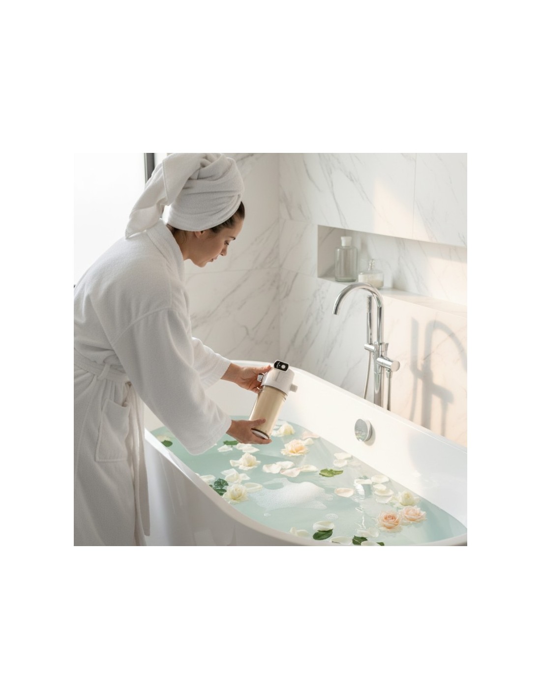 Il s'agit d'un produit écologique et certifié, 100% exempt de sulfite de calcium E226, dont les composants ont été analysés par des organismes prestigieux. Il est préparé pour différents types d'installation et est livré entièrement assemblé, prêt à l'emploi. Sa longue durée de conservation, jusqu'à 50 000 litres (environ 10-12 mois), en fait une solution pratique, économique et durable pour les soins quotidiens de la peau et des cheveux.